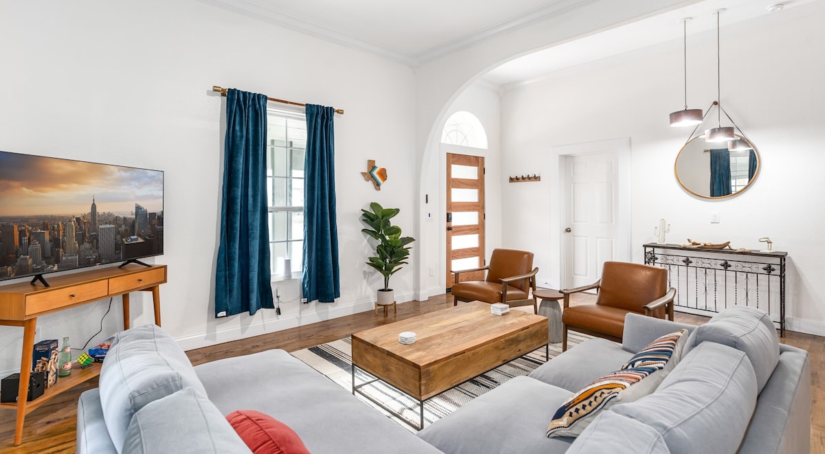 Зачаруйте це чарівне відреставроване помешкання з оригінальними деталями в дерев 'яній підлозі, дверях та оздобленні. (Ми були натхненні взяти на себе власний виправлення після того, як ми переїхали до нашого помешкання, показаного в епізоді 1 сезону 5-го сезону Fixer Upper на HGTV - з місячними дверима!) Це бунгало було спочатку побудоване в 1930-х роках, тому має чудовий характер. Прикрашений бірюзовими акцентними стінами, відкритими стелажами в сільській кухні та меблями середини століття, що робить це помешкання комфортним, але стильним. Лише 2 милі фр.