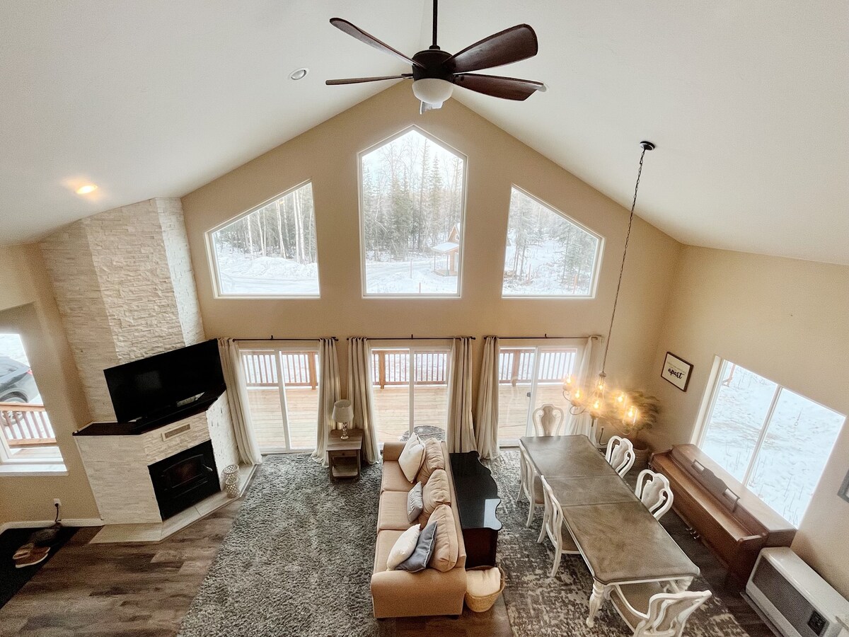 Цей нещодавно побудований сучасний A-Frame пропонує унікальну та розкішну можливість розміщення. До послуг гостей зручне ліжко King Size з хрусткою білизною, вхід без ключа, пральна та сушильна машини, газовий камін, телевізор, Wi-Fi, гідромасажна ванна та великі вікна, щоб ви могли насолодитися прекрасними краєвидами на Алясці в оточенні спокійного лісу. Кухня та ванна кімната забезпечені усім необхідним, щоб почуватися як удома. Насолоджуйтеся затишною та комфортною атмосферою під час приватного відпочинку.