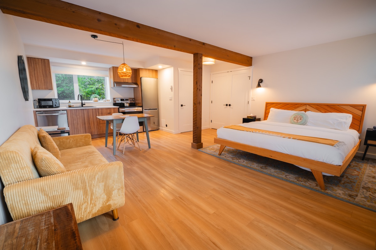 Розташоване біля входу до мережі стежок пляжу Тонкін і в декількох хвилинах ходьби від центру Тофіно. Насолоджуйтеся ліжком розміру King size, повністю обладнаною кухнею та повноцінною ванною кімнатою. Паркуйтеся безпосередньо перед цим просторим і нещодавно побудованим апартаментом! У люксі є ліжко king-size і немає інших спальних місць для додаткових гостей.