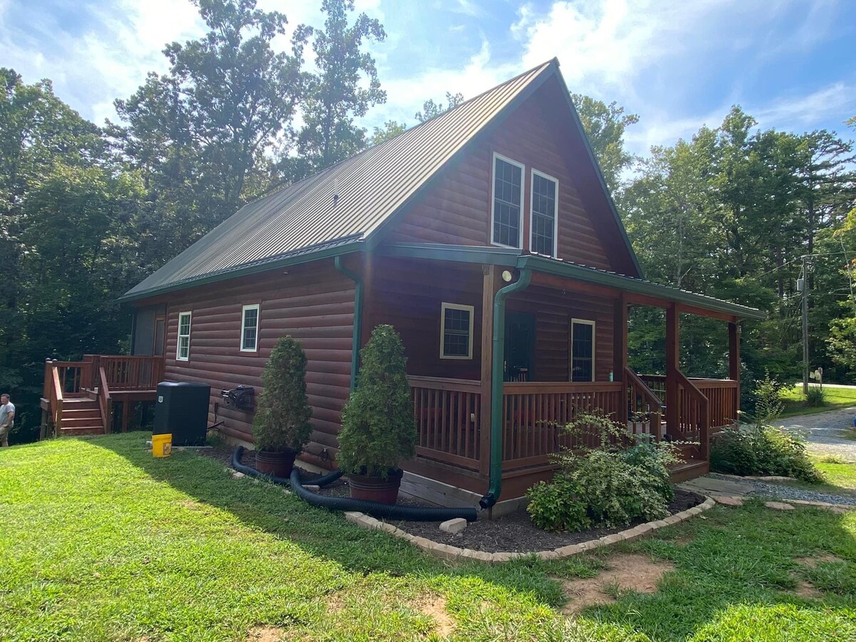 Kerr Lake: cozy, super-cute cabin, w/private lake access in neighborhood less than half mile away. Upstairs bedroom, open LR/kitchenette, one bath, in rural VA. Two-burner cooktop & tiny oven (no dishwasher), plus w&d. King bed, plus a daybed w/pop-up trundle in loft; queen foldout sofa downstairs. Rural satellite wi-fi. Boat parking/fish cleaning station. Fenced in dog-run for well-behaved dog. Hammock, firepit & picnic table lakeside! Front porch for sunset and star viewing!
