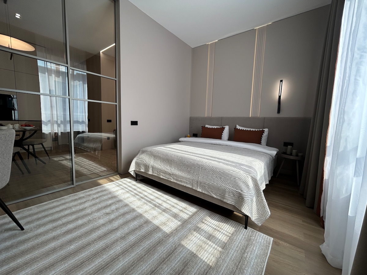 Сучасна студія в самому центрі міста. Є все для комфортного перебування. Арбат знаходиться в пішій доступності. Двоспальне ліжко та розкладний диван, кухня з побутовою технікою та посудом, швидкий Wi-Fi, смарт-телевізор, кондиціонер. Є пральна машина, праска, фен, фен. Надається ванна кімната з душем, рушниками, постільною білизною та засобами гігієни. Магазини, кафе, торговий центр та зручна транспортна розв 'язка знаходяться в пішій доступності. У нас є самостійне прибуття, але ми завжди на зв 'язку 😊