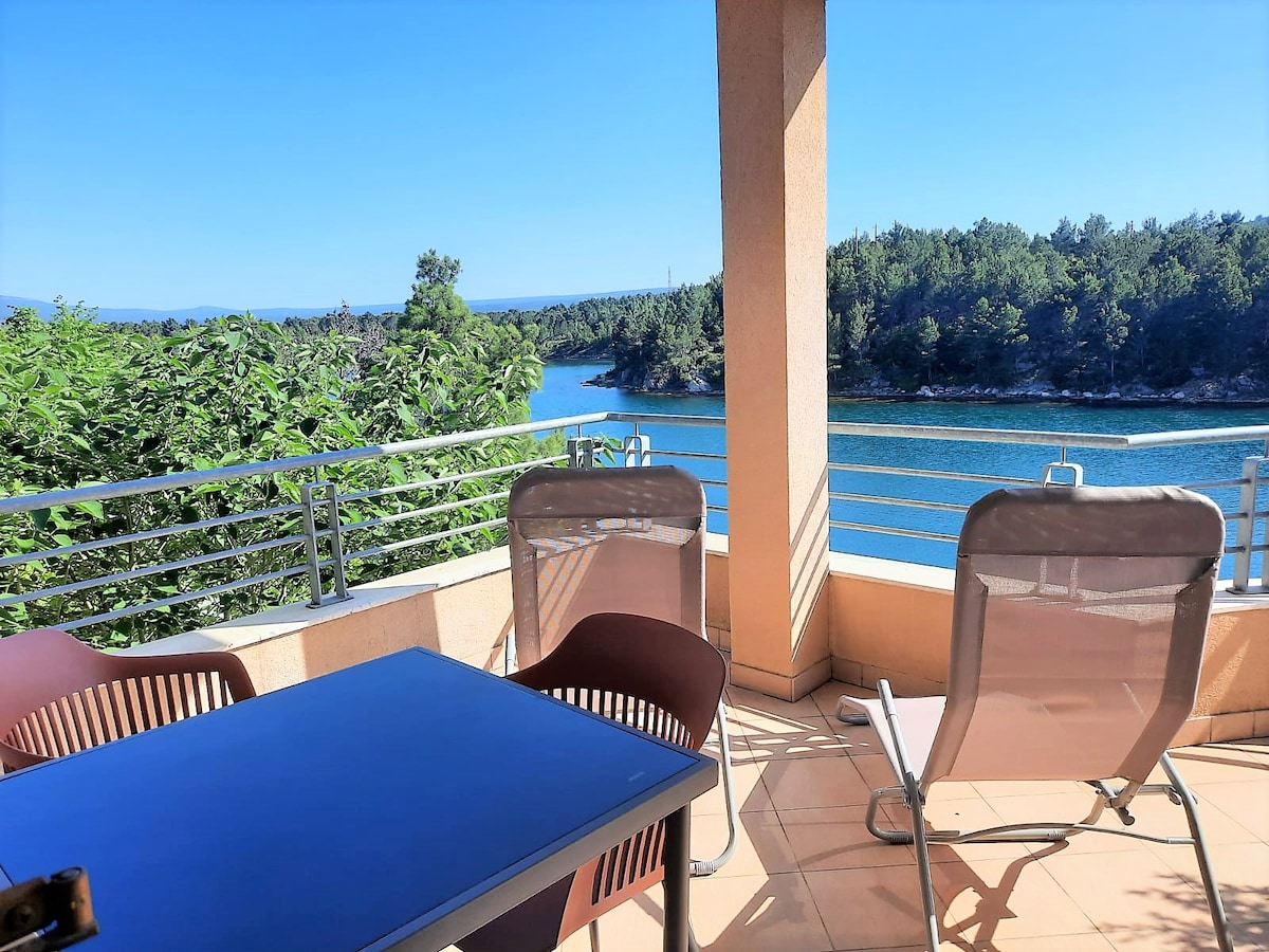 Prekrasan novouređen studio apartman u prvom redu do mora . Savršeno za odmor daleko od buke i komešanja. Apartman se sastoji od spavaće sobe s king size krevetom ( 180x200cm) i 43" smart TV-om, klimom, kuhinjom, kupaonicom i prostranom terasom s koje se pruža pogled na more i zelenu prirodu. Samo par koraka , spuštajući se niz privatne stepenice gosti mogu uživati u suncu, moru i hladu ispod maslina i borova. Privatne ležaljke i vanjski tuš su osigurani za goste.