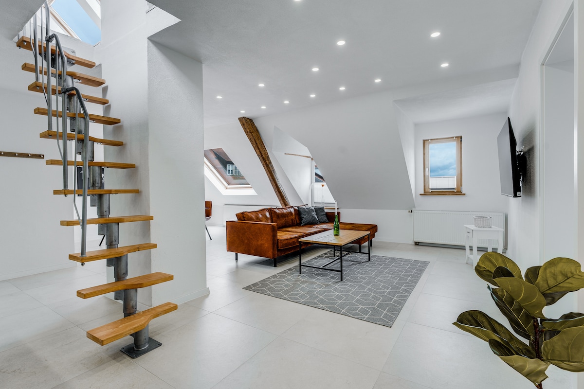 Ласкаво просимо до нашої ексклюзивної квартири на верхньому поверсі в центрі Меммінгена! Простора квартира може розмістити всю сім 'ю або групу друзів із трьома спальнями та просторою вітальнею, їдальнею та кухонною зоною. Сучасна кухня з високоякісним обладнанням та стильним кулінарним островом запрошує вас готувати разом. Особливість - гідромасажна ванна з фантастичним видом на Меммінген – чистий відпочинок у центральному місці!