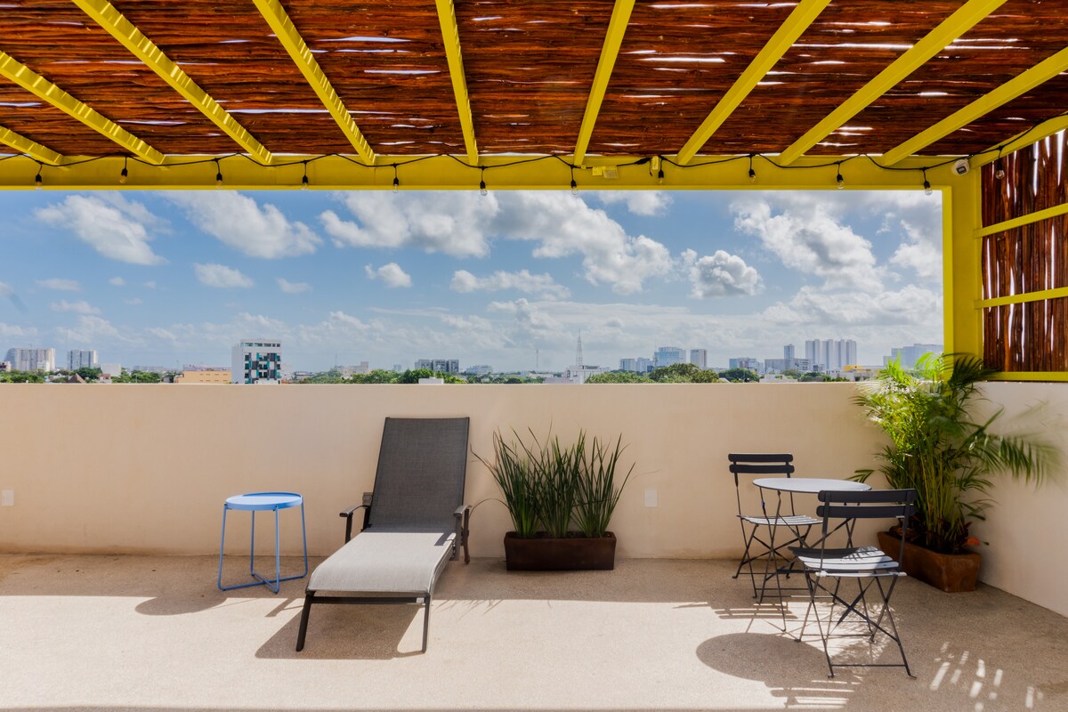 Комфортне розміщення в центрі міста, навпроти Mercado 28. Вона має дві затишні кімнати, вітальню, велику відкриту терасу, їдальню, ванну кімнату, кухню та всі необхідні послуги, щоб насолодитися перебуванням. Неперевершене розташування в центрі міста, в оточенні ресторанів, аптек, банків, супермаркетів, з легким доступом до громадського транспорту до пляжів готельної зони, торгових центрів, терміналу ADO та порому для відвідування острова Мухерес.