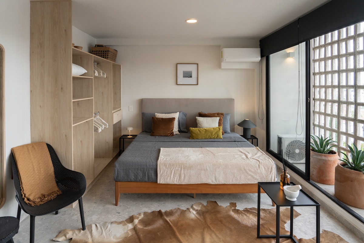 - Затишна та ексклюзивна студія з ліжком queen-size, столом та кондиціонером. - Балкон для свіжого повітря. - Обладнана кухня. - Вхід із смарт-замком та індивідуальним ексклюзивним ключем для кожного гостя. - Панорамний дах з рестораном на 9-му поверсі – кімната для переговорів, обладнана для професійних зустрічей (перевірте наявність); – Цілодобовий доступ за допомогою спеціального коду. ВАЖЛИВО: у нас немає приватної парковки всередині помешкання.