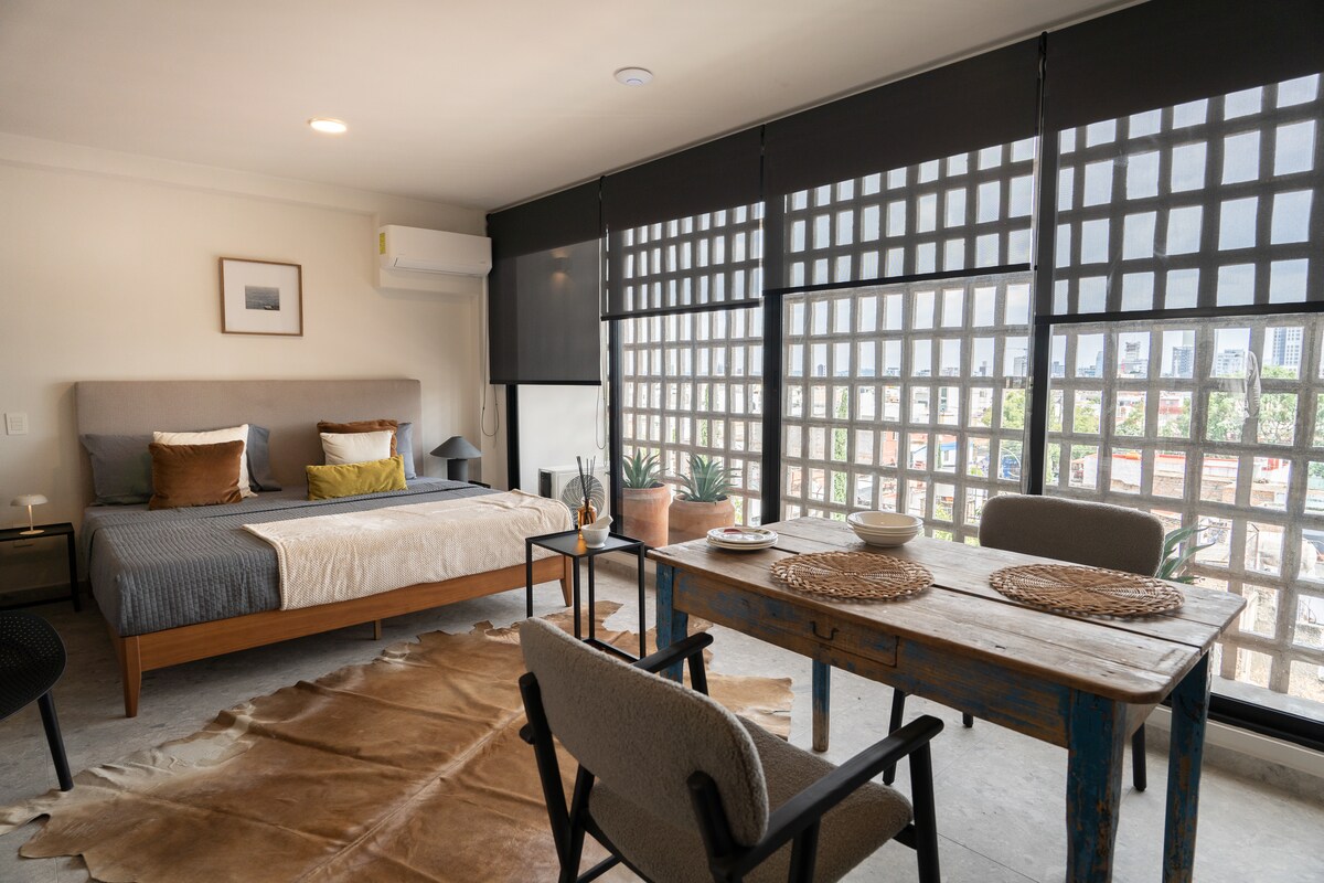 Насолоджуйтеся Гвадалахарою, перебуваючи в цьому затишному приміщенні, обладнаному усім необхідним для приємного перебування: техніка, білі, Wi-Fi, Netflix Відмінне розташування швидко з 'єднує вас з основними туристичними об' єктами міста. 5 хвилин від коридору Чапультепек (бари, ресторани та зона культури) 10 хвилин від Фінансової зони 15 хвилин від історичного центру Зручності поблизу: громадська парковка в 1 кварталі Аптека в 2 кварталах Ринок і торговельна зона в 3 кварталах