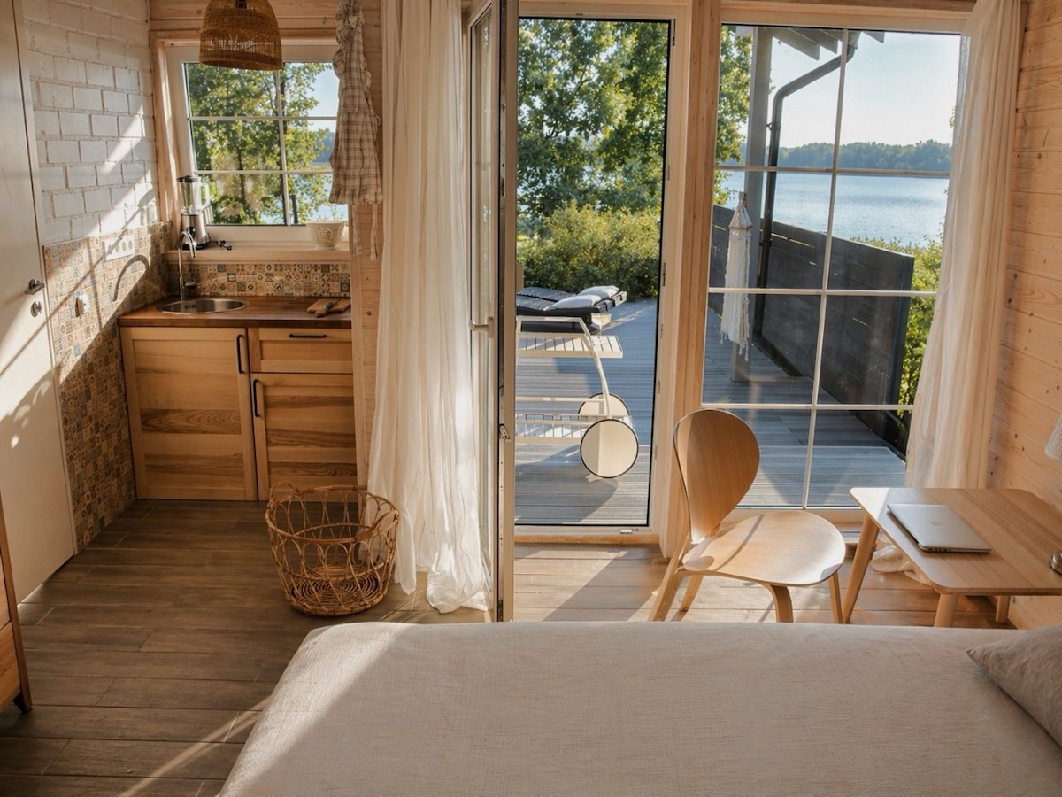 Будиночок із просторими терасами, шезлонгами, вуличними меблями, грилем для барбекю та дивовижним видом. Сауна, поруч з липою, що веде до озера, берег пристосований для дітей. У будинку: міні-кухня з вітальнею, ванна кімната, мансарда для дітей та спальня. Постільна білизна, посуд, кава/чай, пральна машина, рушники, Wi-Fi, грилі, сауна. Поруч: регіональний парк Метеляй, оглядова вежа Метеляй, туристичний центр, водоспад Кумице, кургани. Насолоджуйтеся цією прекрасною романтичною оселею в оточенні природи!