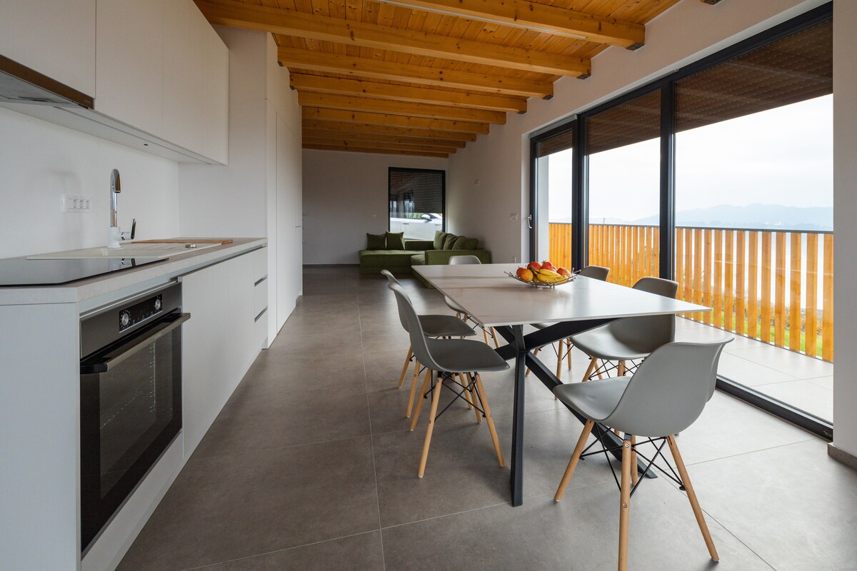 New holiday villa built on top of an old wine cellar. Calm and peaceful location on the hilltop between the vineyards. In close proximity to the local tourist destinations and spa resorts in Podčetrtek, Rogaška Slatina, Rogatec and Šmarje pri Jelšah. Amazing view from the terrace and both bedrooms to all the nearby and far hills, vineyards and farms.