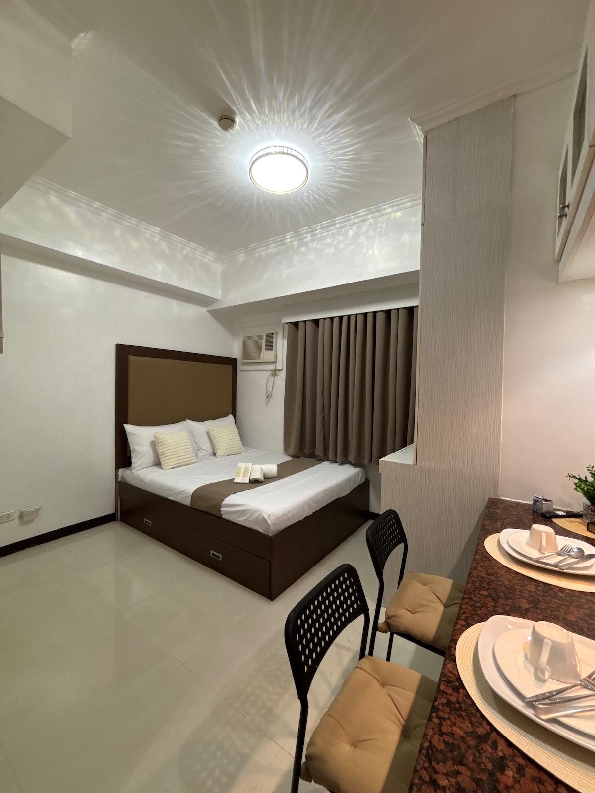 Thoughtfully designed with a modern touch, this cozy 43rd-floor studio offers comfort and convenience for travelers, couples, or remote workers. Enjoy peaceful mornings and restful nights above the city skyline. • Comfy queen bed with fresh linens • Equipped with iron and hair dryer for your convenience • Clean and cozy space for a relaxing stay • Near Robinsons Place, Intramuros, and Luneta Park • Located right across the U.S. Embassy Manila