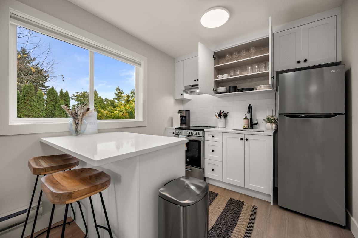 Дип-Ков-Вілледж, що знаходиться за 25 хвилин від центру Ванкувера, – це прекрасний туристичний район біля підніжжя гори Сеймур (катание на лижах) зі стежками, пляжем і можливістю прогулянок на байдарках. Наш котедж знаходиться в декількох кроках від стежки Баден-Пауелл, Кваррі-Рок, магазину каное та каяків Deep Cove, бістро/кав 'ярень, парку Панорама, театру та центру мистецтв Діп-Коув. Наш люкс - це новий надземний об 'єкт нерухомості в тихому районі біля річки з видом на воду та ліс. Одна спільна стіна з основним помешканням. Архітектурний дизайн, зі смаком обставлена.