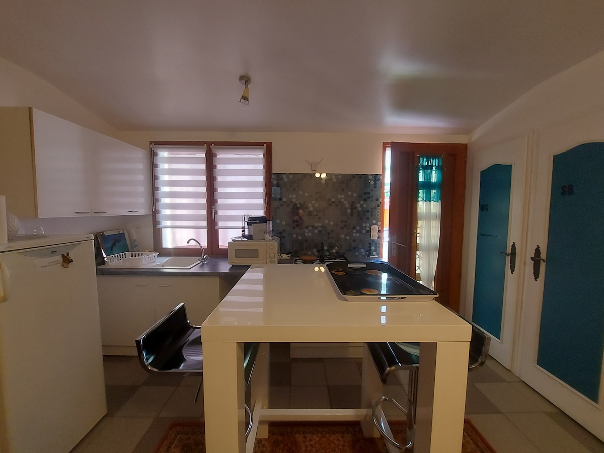 Помешкання площею 50 м2 розташоване на 1-му поверсі будинку , до якого можна дістатися за допомогою зовнішніх сходів, що складаються з : • Вітальня з кухнею, обладнаною холодильником, мікрохвильовою піччю ,духовкою та необхідним для сніданку ( чайник , тостер та кава тасімо) ,зоною відпочинку з диваном-ліжком ,телевізором та обідньою зоною. • Одна спальня з двоспальним ліжком 160 x 200 і телевізором • Мезонін з 2 односпальними ліжками та комодом . • Тераса з тентом.