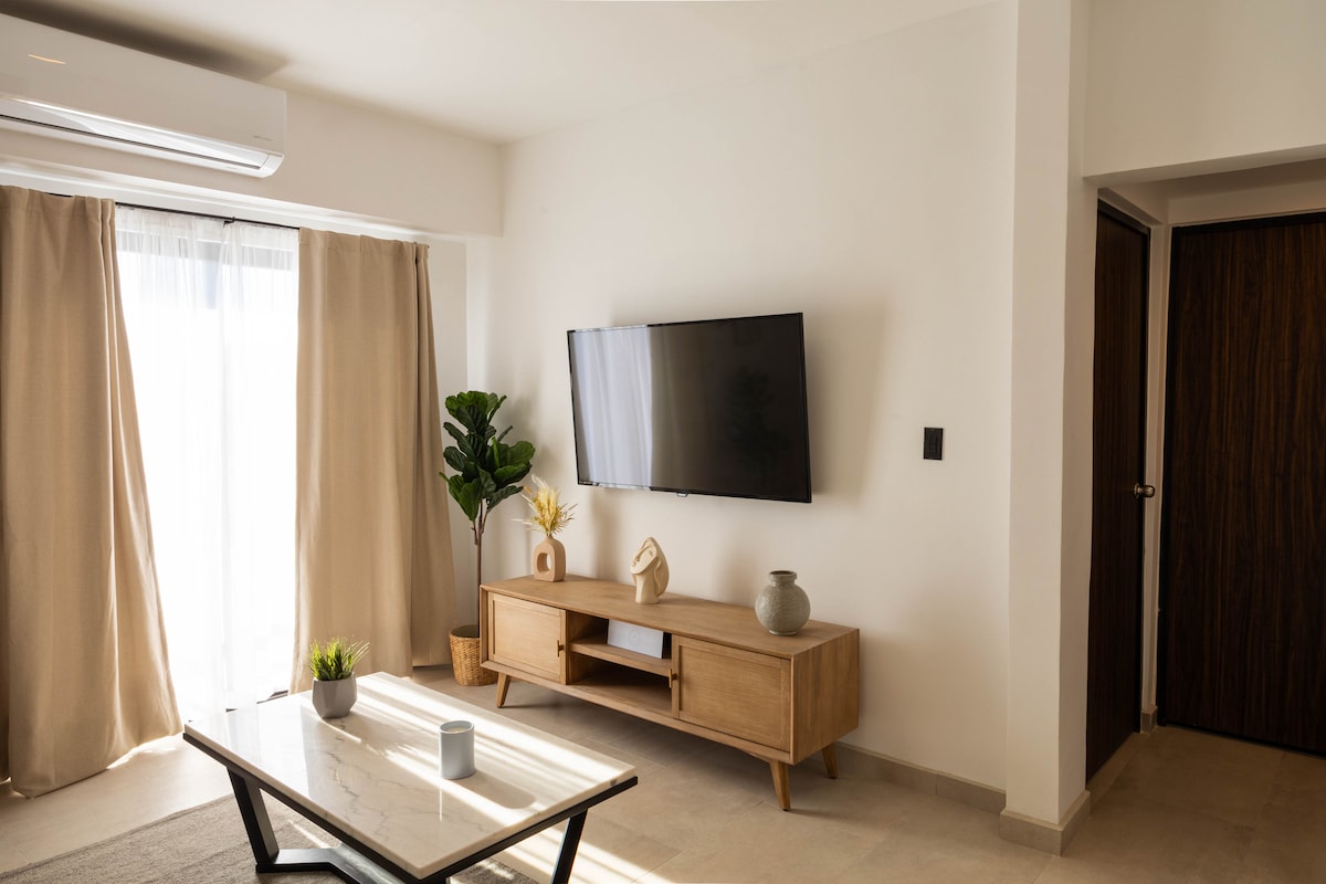 - Сучасна квартира з 2 спальнями на 5-му поверсі, за кілька хвилин від Плаза Качанілья - Доступ до ліфта для зручності – самостійне прибуття за допомогою смарт-клавіатури; - Парковка для 2 автомобілів - Кондиціонер у всій квартирі - Повністю обладнана кухня, їдальня та пральня - 75-дюймовий телевізор 4K Smart TV з Netflix, Disney+, Amazon Prime та HBO - Комунальна тераса на 9-му поверсі з бізнес-центром, грилями та зоною відпочинку - Доступ до соціального клубу: басейн, тренажерний зал та ігрова кімната - Ми виставляємо рахунки-фактури MX (Facturamos)