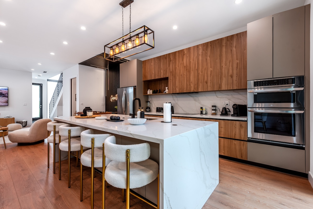 З того моменту, як ви зайдете всередину цієї професійно оформленої вілли з 2 спальнями/2 1/2 ванними кімнатами, ви почуватиметеся комфортно і як удома. Закохайтеся у високі дерев 'яні балочні стелі, теплі тони та дивовижну відкриту кухню з островом на 6 місць. Диван у вітальні - це мріяти лежати, відпочивати та дивитися фільм після довгого дня, насолоджуючись містом. Обидві спальні мають надзвичайно зручні висококласні ліжка queen-size з окремими ванними кімнатами та душем. Безкоштовна стоянка на території для 2 автомобілів.
