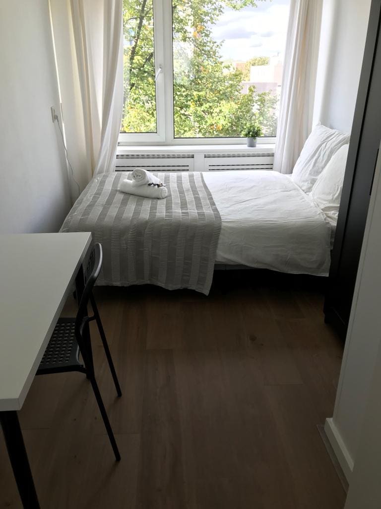 Охайна мебльована спальня для однієї акуратної жінки в чистій квартирі. З номера відкривається прекрасний вид на центр Шидама. 10 хвилин пішки до центрального вокзалу Ш 'єдам. 1 хв пішки до трамвая безпосередньо до центрального вокзалу Роттердама та центру. 10 хвилин пішки до торгового центру Schiedam. Тепер у кімнаті є товсті штори, щоб затемнити кімнату під час сну! Ви маєте доступ до акуратної мебльованої ванної кімнати, туалету та кухні.