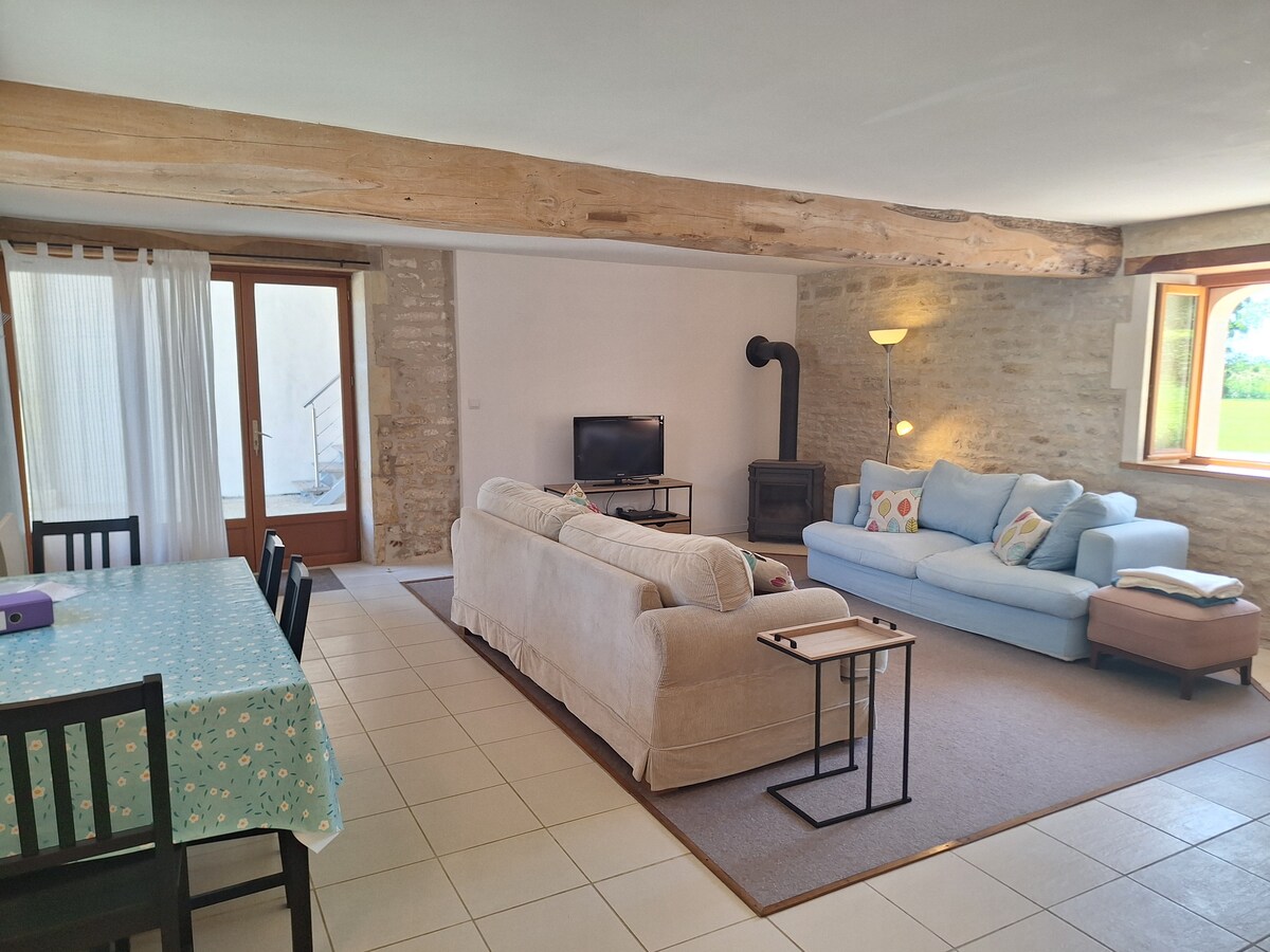 Dans la famille depuis huit générations, cette ancienne ferme,située au coeur de la Saintonge, a conservé son authenticité et son charme. Vous logerez dans l'ancienne écurie de ma grand mère recemment restaurée. Amoureux de nature et de tranquillité, vous partagererez notre corps de ferme avec chats, poules et lapins. A disposition jeux, jouets, livres. En plus du jardin, un petit bois avec bancs et hamac. Brochures touristiques. Pas de frais de ménage mais laisser le logement propre. Merci