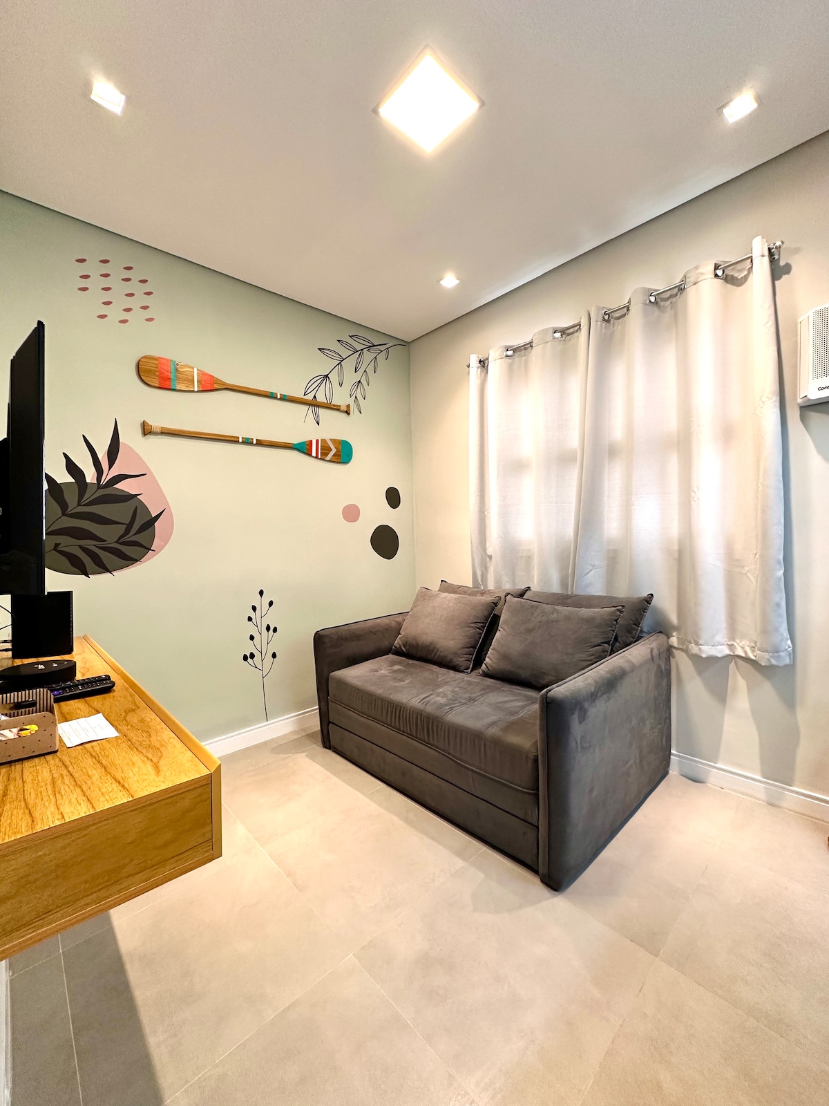 Deixe a rotina lá fora e venha relaxar com uma vista que vai te conquistar 💙 Temos quarto com cama Queen oriental com colchão Castor padrão hotelaria, sala de estar com sofá-cama casal (espuma D33) e smart TV de 43 polegadas com apps HBO Max, Disney, Prime e Apple TV, além de cozinha equipada. O espaço também conta com ar condicionado Split de 18.000 Btus. Além disso temos espaço para home office, com internet fibra de 500 MB, frente para o oceano. Espaço kids, salão de jogos e Pet Place 🐾