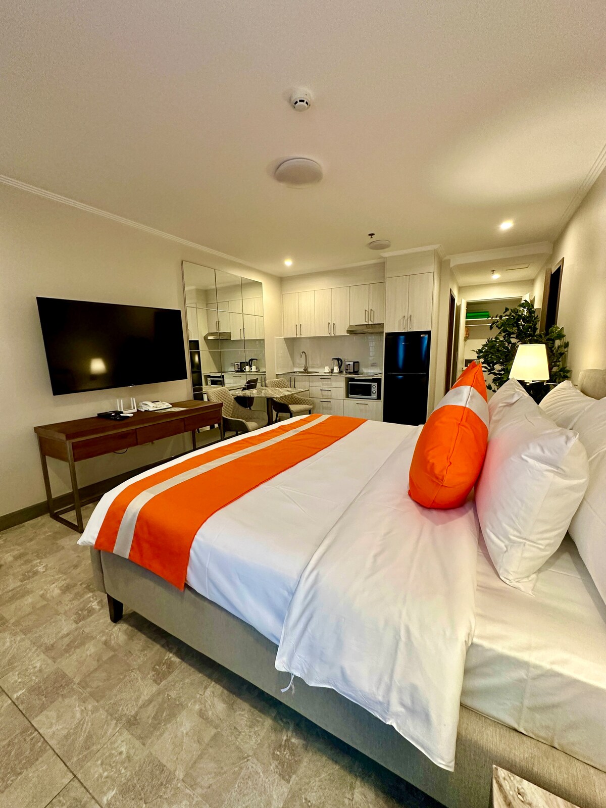 2nd floor studio with patio above pool, Executive Internet package, 55" Samsung Smart 4K TV, fully equipped kitchen with new cookware, utensils, and flatware. New drip coffee maker, microwave. A non-smoking unit with walkout balcony overlooking the pool area. La Grande Residence has become the premier choice for both business and tourists visiting Clark Freeport and the Pampanga area. Kick back and relax in this calm, secure, and stylish space.