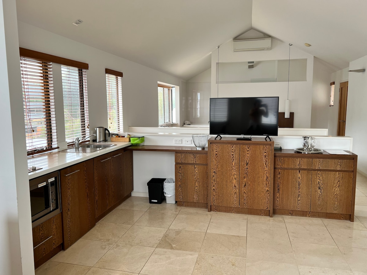 stableBASE – це сонячний, спроектований архітектором флігель нашого будинку, розташований за декілька хвилин їзди від центру Олбані, пляжів, мальовничих прогулянок і національних парків. Помешкання просторе, продумано оформлене, з високоякісним обладнанням і вміщує до 4 гостей: • Головна спальня: двоспальне ліжко та ванна кімната • Друга спальня: два односпальні ліжка розміру King size та ванна кімната Житлова зона поєднує в собі вітальню, їдальню та повністю обладнану кухню з індукційною плитою, що виходить на приватну сонячну терасу.