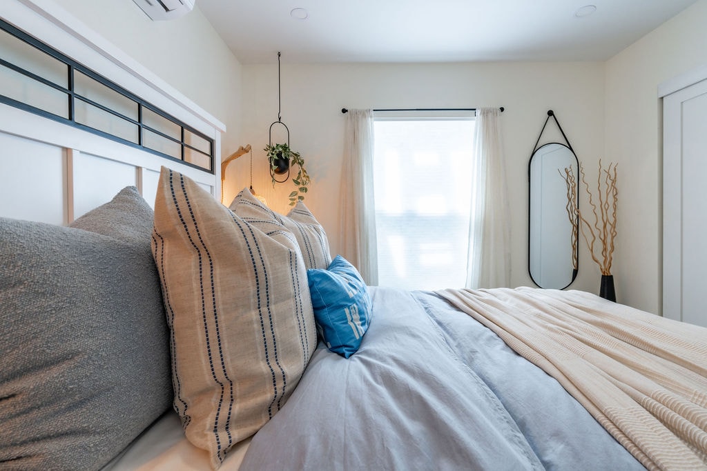 Mid-Century Modern inspired fully remodeled 1-bdrm + 1-bath beach bungalow with an additional Queen sofa pull-out bed for up to 4 people. All new interior finishes, air conditioning, heating, appliances, and furniture. Located on the nicest pedestrian-only court in Mission beach, this quiet community is occupied by long-term native SD residents. This cozy high-end contemporary home is perfect for a quiet & relaxing beach vacation. Unsafe for children (under 12), infants, or pets.