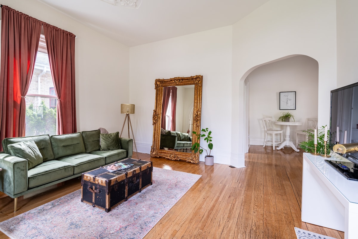Чарівна квартира з 1 спальнею з великим двоспальним ліжком, залита природним освітленням і простим, але шикарним дизайном, щоб підкреслити характер і історичні елементи простору. Квартира повністю обладнана кухонними зручностями, ліжком розміру «queen size» та просторою кухнею та вітальнею, знаходиться в декількох хвилинах ходьби від ресторанів у центрі міста, патіо, кави та незалежних торговців. Прогуляйтеся ще за декілька хвилин, і ви опинитеся в мальовничому парку Стратфорда на озері Вікторія.