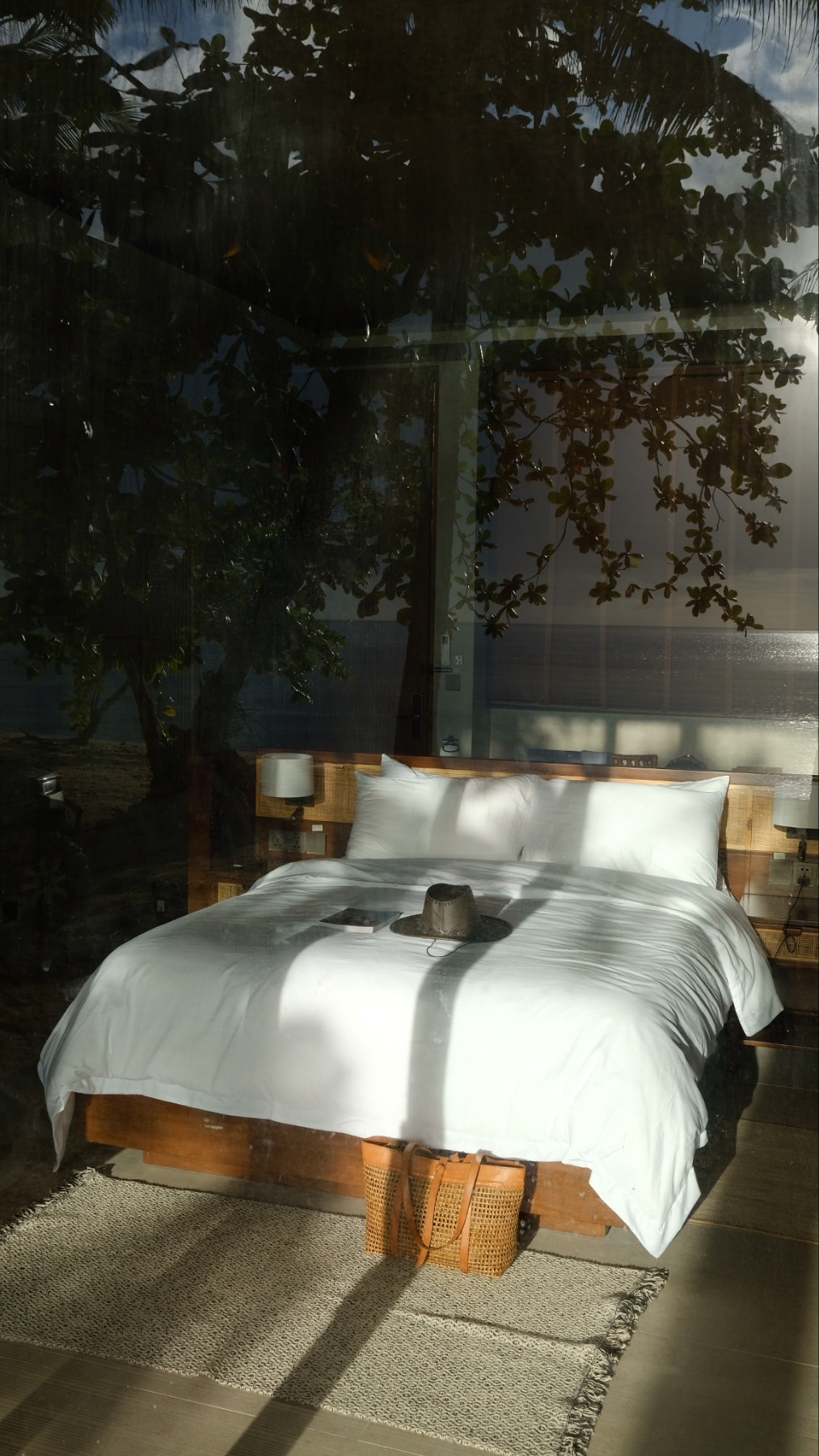 This is a dream cottage for adventurous romantics. It has a full-size bed (excellent for 1, snuggly for 2) , a view of the sea, a movable dining nook that overlooks the garden of Balai La-Hi. Sheets and towels are provided. This is an independent fan-cooled cottage beside the host house. Relax and feel the peace, You are safe here. Welcome home.
