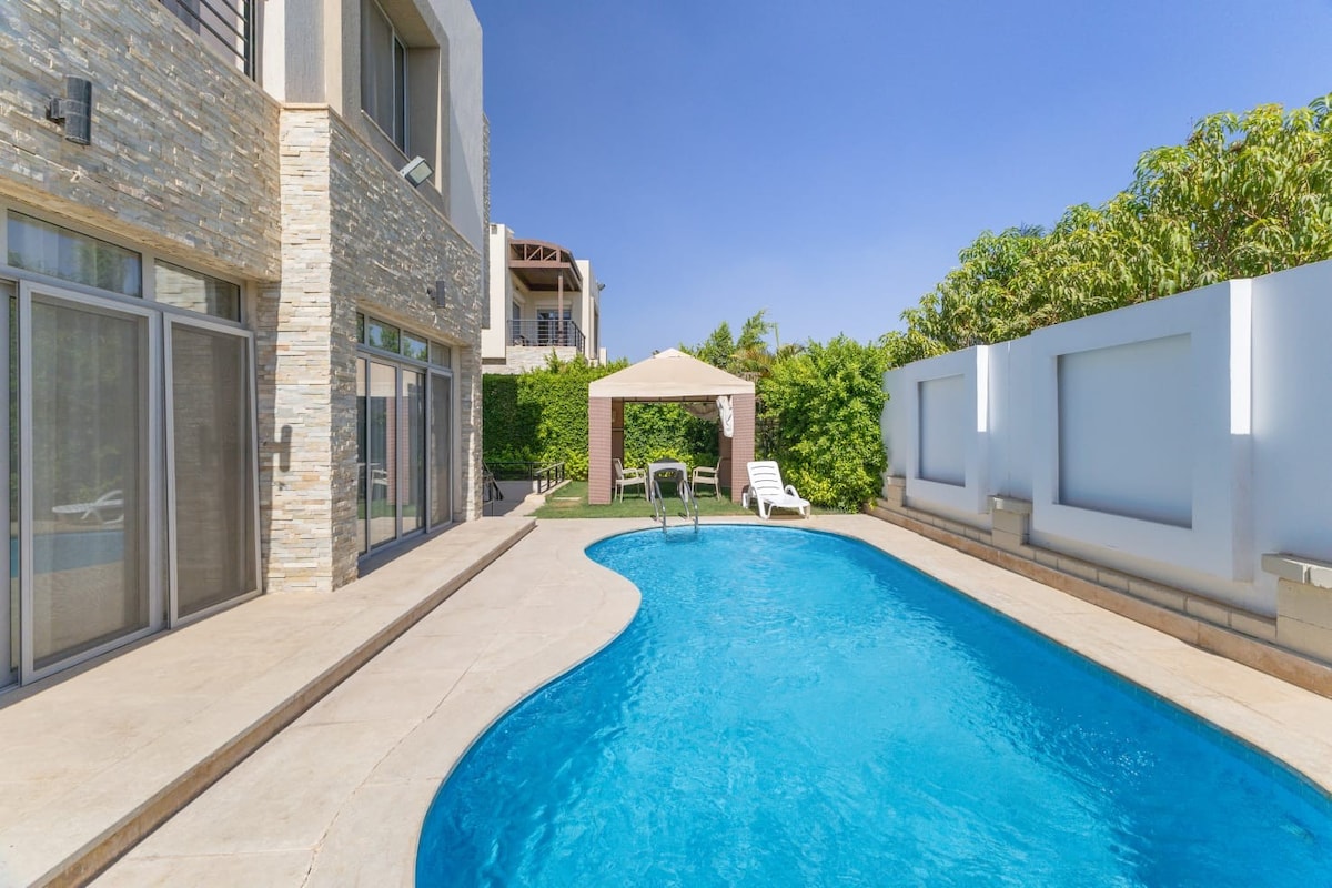 Сучасна та стильна простора вілла + гарний сонячний садовий будинок у Golf Al Solaimaniyah, 15 хвилин від міжнародного аеропорту Сфінкс. Вілла оточена приватним садом площею понад 800 кв. м, басейном 10*5 і лісом, що гарантує усамітнення та спокій. Прогулюйтеся класичними садами, відпочиньте біля басейну або проведіть день у чудовому новому Великому єгипетському музеї, а піраміди Гізи знаходяться всього за 25 хвилин. Вілла має гарне транспортне сполучення, з супутниковим телебаченням/ SMART TV та Wi-Fi.