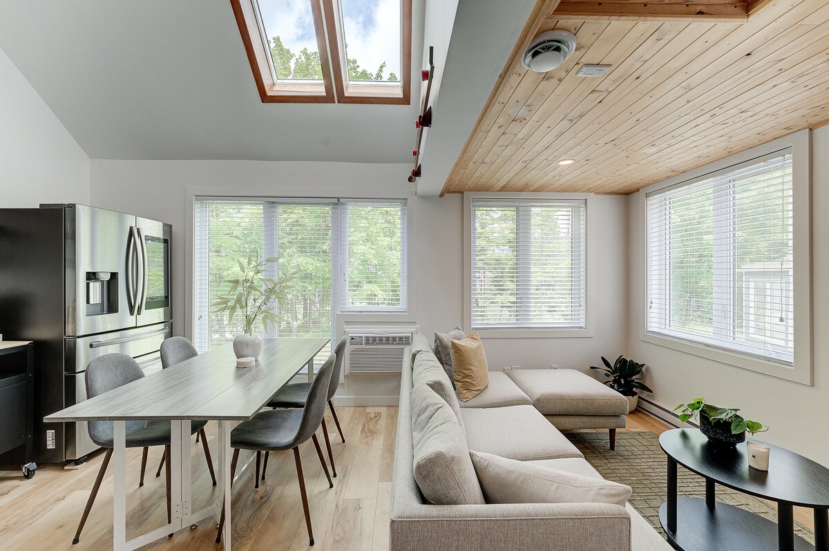 Розслабтеся та відпочиньте всією сім 'єю в цьому приголомшливому кондомініумі, до якого можна дістатися лише сходами з окремим балконом і приголомшливим видом на гори в центрі Мон-Трамблана! Цей кондомініум, до якого можна дістатися лише сходами, ідеально підходить для сімей, які шукають зручне та доступне місце, щоб залишитися на гірськолижному курорті Мон-Трамблан. Кондомініум розташований в центрі озерної громади, всього в декількох хвилинах ходьби від схилів, магазинів і ресторанів.