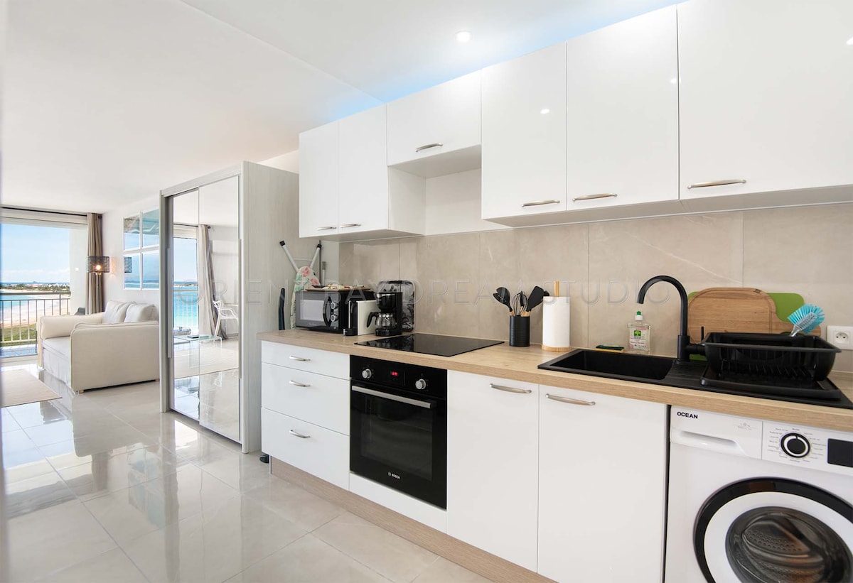 Це найкрасивіший вид у всій Орієнт-Бей! Вражаюча панорама на весь пляж Орієнт-Бей, Сен-Бартс, острів Тінтамарре та частину острова Пінель. Дійсно унікальне враження. Квартира повністю відремонтована: 2 окремі спальні (без спільних стін = ідеальна приватність для двох пар), двоспальні ліжка, 2 ванні кімнати, 2 туалети. Мезонін з односпальним ліжком (90×200). Повністю обладнана кухня. Потрійна експозиція = природна вентиляція. Прямий доступ до пляжу Орієнт-Бей.
