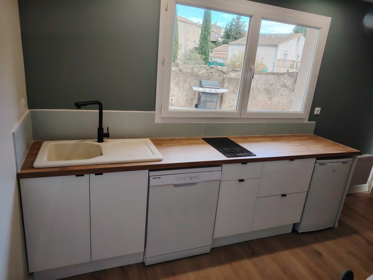 Затишна квартира на першому поверсі нашого будинку, з терасою, барбекю та джакузі. Кімната для відпочинку (ліжко 160 см) без вікна: прохолодна, тиха, повна темрява для глибокого та спокійного сну. Повністю обладнана кухня, кондиціонер, Wi-Fi. Чудове розташування для дослідження Мезе, Пезенаса, Сета, Салагу, Кап д'Агде, Монпельє... Ціни скориговані на тривалість.