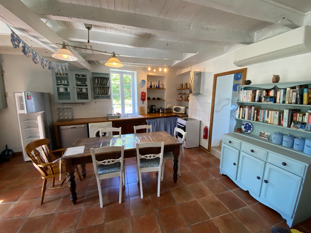 Великий старий фермерський будинок, повністю відремонтований у 2020/2021 році, на 10 осіб. Великі вітальні (вітальня 40 м2, кухня, їдальня 30 м2), 2 головні спальні з душовими кімнатами, 2 дитячі/підліткові спальні з 3 ліжками на спальню та 1 велика ванна кімната. Помешкання розташоване на закритій ділянці площею 1000 м2, оточеній лісистою ділянкою площею 7000 м2. Приватна парковка на 3 автомобілі. Відкритий басейн 4 м на 8 м. Простирадла, рушники в оренду не входять.