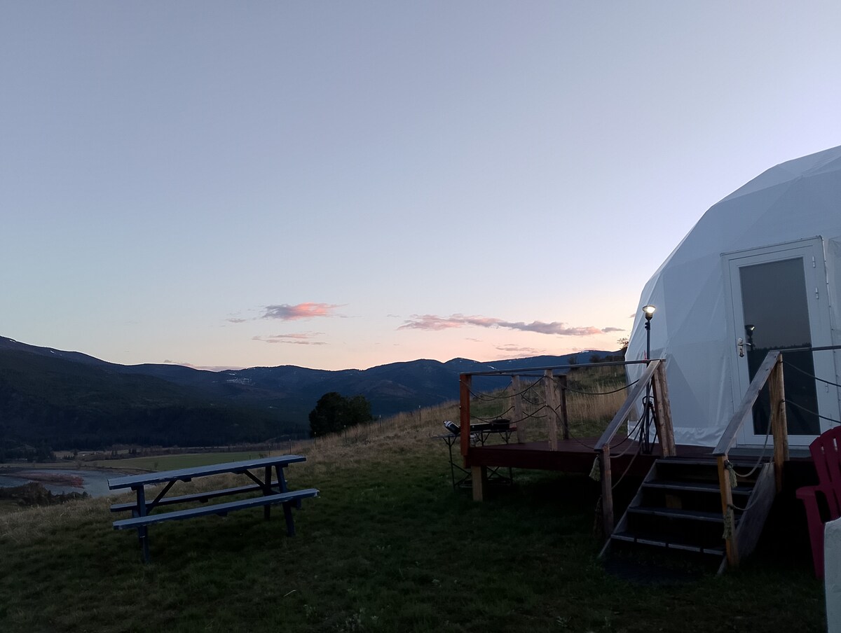 Цей купол підходить для всієї сім’ї. З 1 ліжком queen-size і двома односпальними ліжками. Насолоджуйтеся дивовижним видом на річку Кларк-Форк і 360* навколишніх гір. Усередині купола немає електрики або ванної кімнати. Надаються пропановий обігрівач Buddy, акумуляторні вентилятори та ліхтарі, а також питна вода в пляшках. У нас також є біотуалет і станції для миття рук на території глемпінгу. Розслабтеся, від 'єднайтеся та відновите зв' язок із природою. Там, де зірки – ваші нічні ліхтарики.