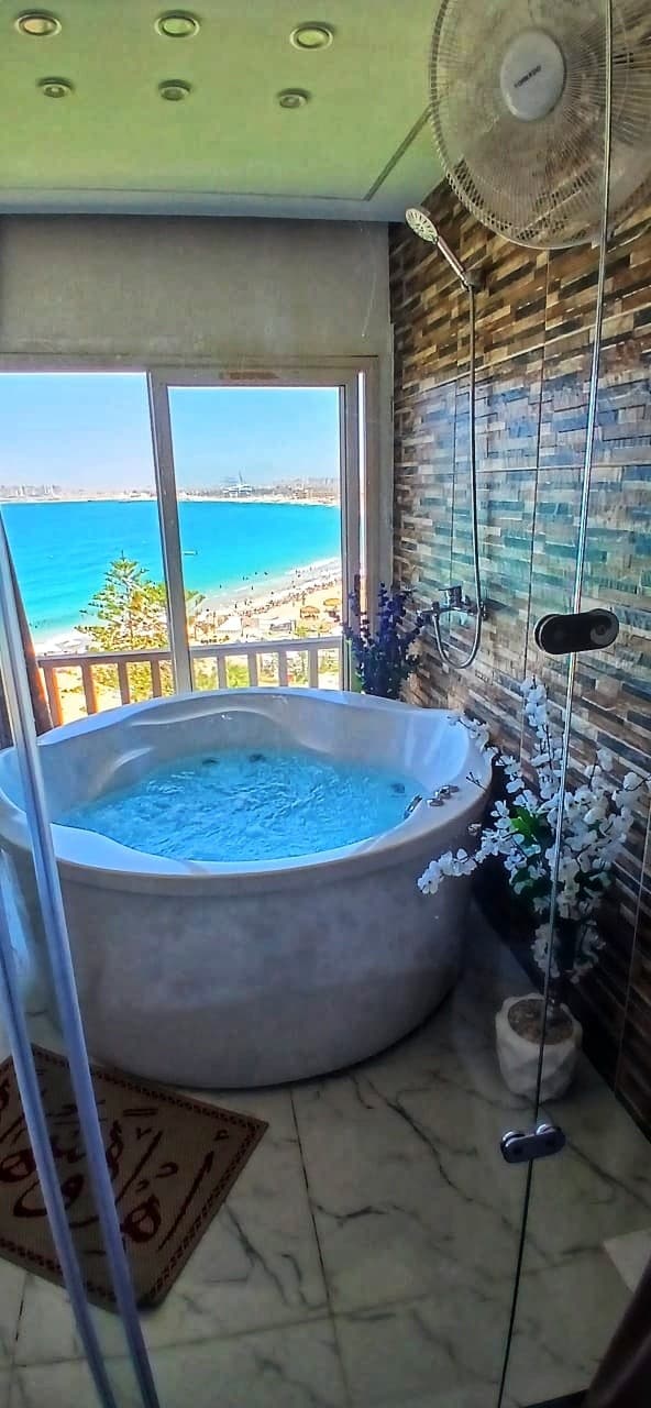 Вишукана квартира на пляжі Александрії в районі Монтаза. Вона складається з трьох спалень з 6 ліжками, двох ванних кімнат, великого залу, що містить їдальню, салону та вітальні. Окрім того, є вид на море через зал. І великий балкон, на якому є диван і стільці з лози та класичного бісеру. Квартира розташована на дев’ятому поверсі, звідки відкривається унікальний краєвид на пляж, який ви ніколи раніше не бачили.