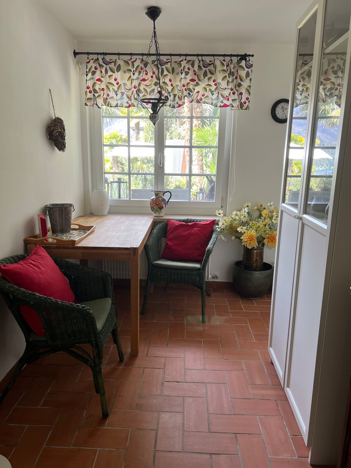 The apartment is located on the raised ground floor. Very bright and welcoming. Equipped kitchen. Nespresso coffee machine with 10 free capsules available. Garden shared with the owners. Hammock and grill usable. Situation: the apartment is located in a very quiet area; public transport and supermarkets just a few minutes away. The village of Ascona is a 15/20 minute walk away.