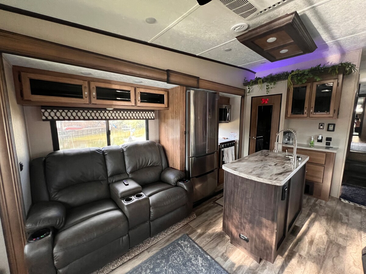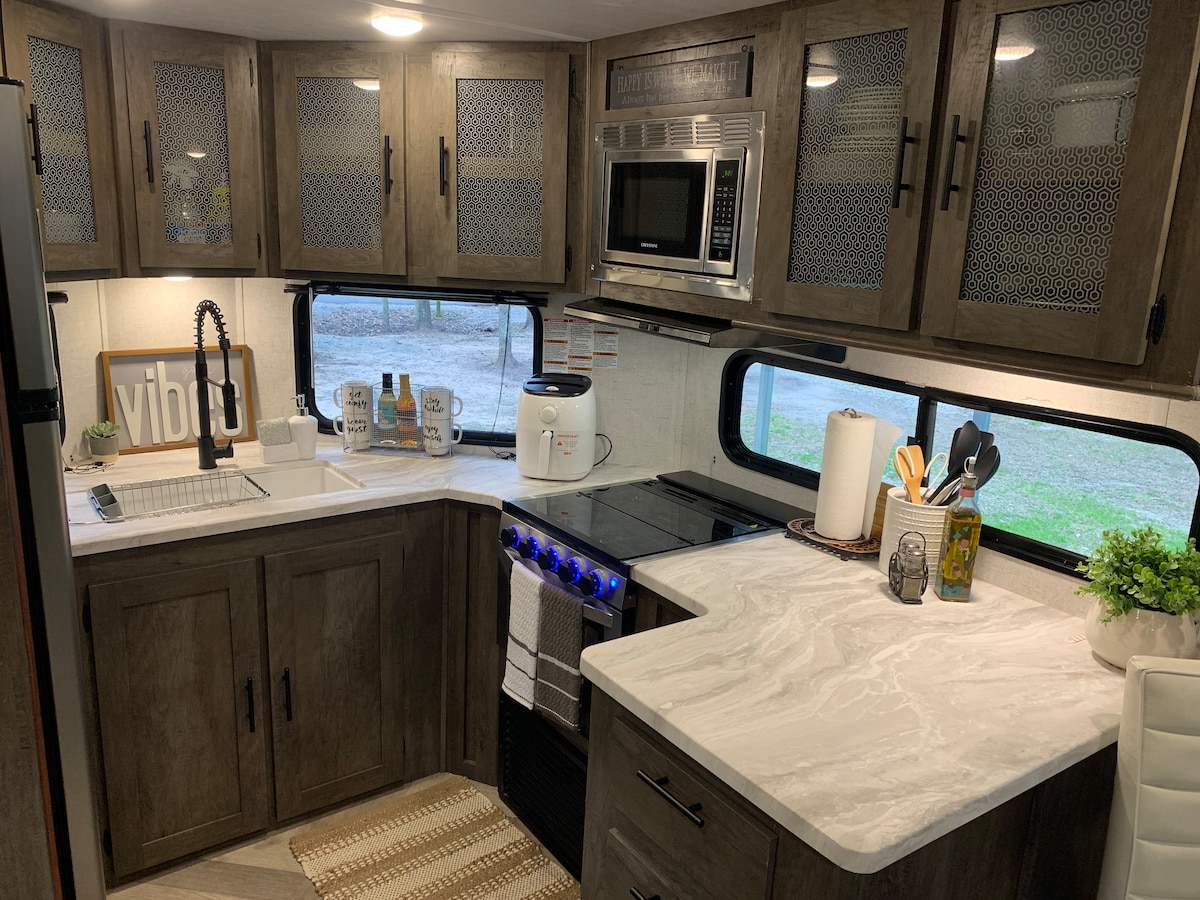 Це незабутнє місце зовсім не звичайне. Ви коли-небудь хотіли досвід роботи з фургоном, але з легкістю та красою? На нашому п 'ятому колесі є все, що ви маєте в інших помешканнях для оренди та багато іншого. Ви забудете, що перебуваєте в фургоні з пишним диваном, каміном, високими стелями, повністю обладнаною кухнею, двоспальною раковиною, а також дорослими та дитячими апартаментами. Це враження від фургона здує ваш розум! Крім того, басейн/спа, батут, ніндзя та місце для багаття з БЕЗКОШТОВНИМИ ДРОВАМИ - це весело для всіх!