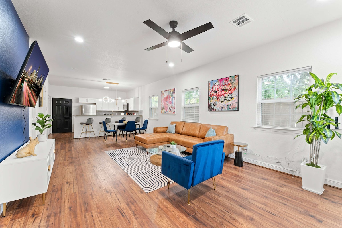 Чистий будинок, красивий декор, оригінальні твори мистецтва, закритий паркінг/електромобіль, центральне розташування в мистецькому районі, швидкий Wi-Fi. Насолоджуйтеся розкішним комфортом у центральному місці недалеко від центру Х 'юстона. • 5 хвилин їзди до центру міста. • 10 хвилин до Галереї • 15 хвилин до Медичного району • Закрита під 'їздна доріжка • Повністю обладнана кухня з кухонними інструментами • Дитяче ліжечко/високий стілець • Швидкий Інтернет 1 Гбіт/с • YouTube TV з ESPN, NFL Network, CNN, Univision • 65-дюймовий телевізор у вітальні та телевізор у кожній кімнаті • Безкоштовні туалетно-косметичні засоби • Дощовий душ «спа-ванни»