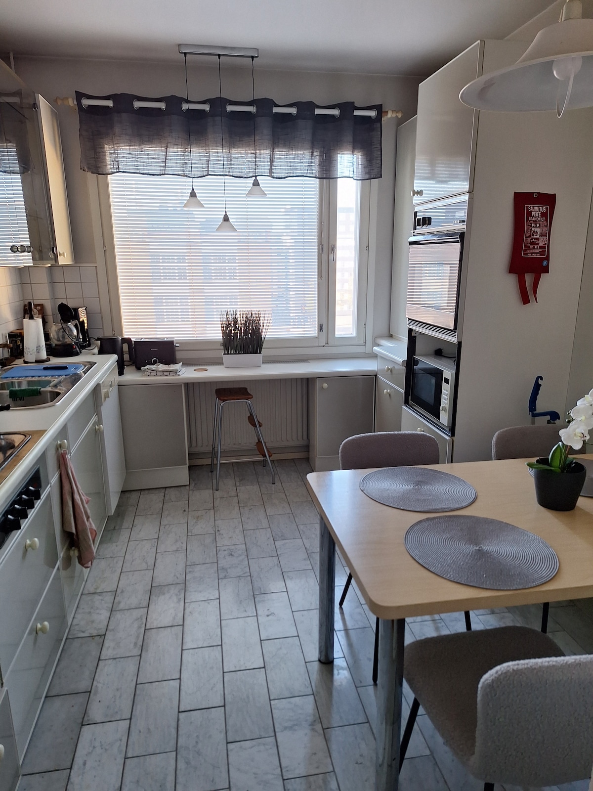 Спокійна та затишна квартира в будинку з ліфтом, до якої легко дістатися пішки, на трамваї або на машині, обладнана всім необхідним базовим обладнанням для приємного міського відпочинку або домашнього проживання під час відрядження. Nokia Arena, Tampere-talo, Музей Мумі-тролів, стадіон Таммела та церква Калева знаходяться всього в 15 хвилинах ходьби. На трам трамваї ви дістанетеся до TAYS приблизно за 10 хвилин. У тому ж комплексі, що й квартира, є K-Supermarket, Alko, ресторани та платна парковка.