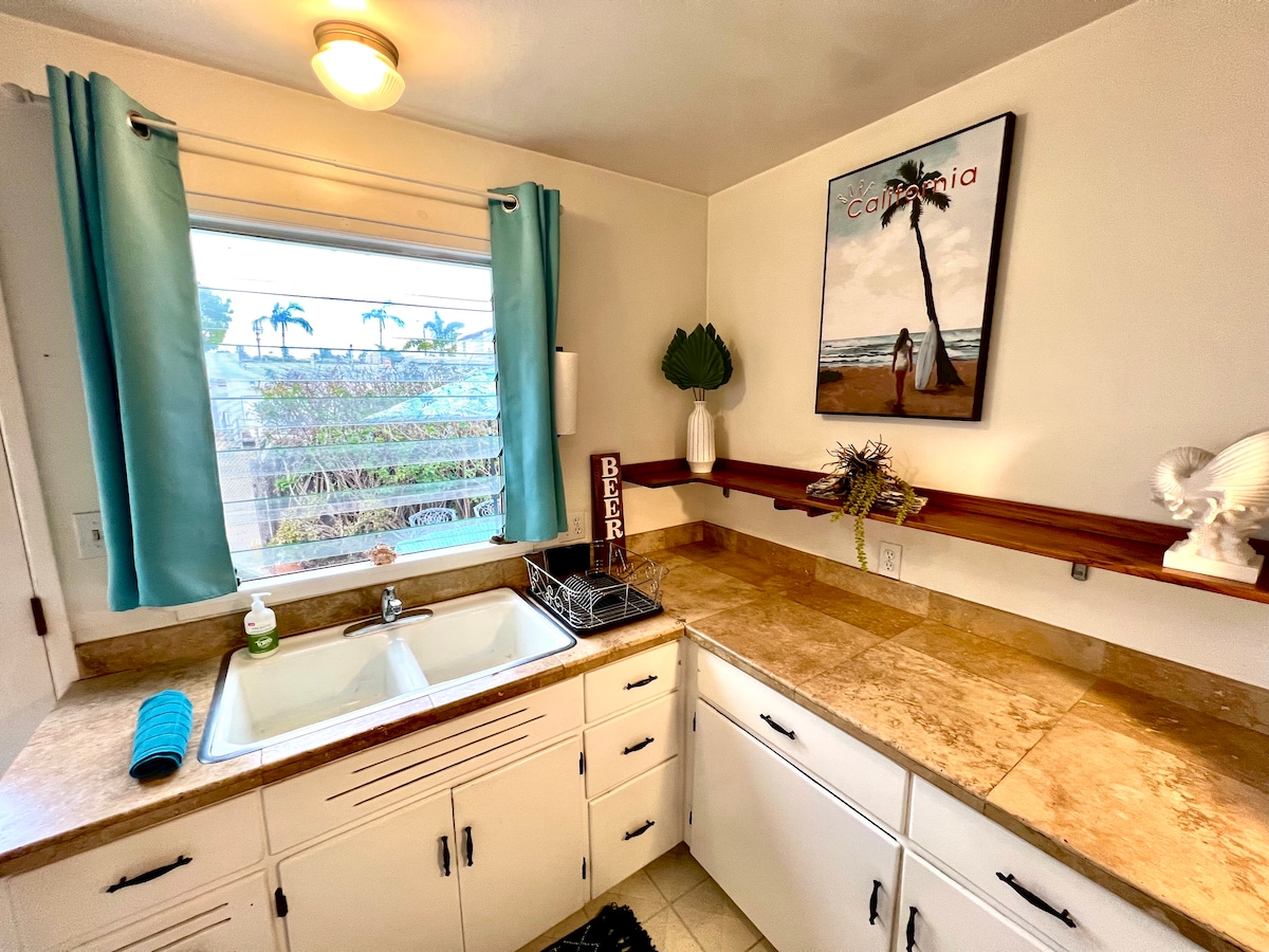 Окремий закритий вхід до окремого гостьового апартаменту, який займає нижній рівень помешкання під назвою «Будинок на дереві любові» (без спільних приміщень). Насолоджуйтеся заднім двором наодинці! 1 зручне ліжко розміру «queen-size» та 1 затишний диван, 65-дюймовий телевізор, холодильник/морозильна камера, мікрохвильова піч, кавоварка Nespresso, повноцінна ванна кімната з гарним душем та кілька патіо, щоб насолоджуватися пишним тропічним заднім двором і сонцем. Відкритий душ для серфінгістів і гамак для відпочинку. Поруч/на відстані прогулянки до океану, парку, чудових місцевих ресторанів/барів.