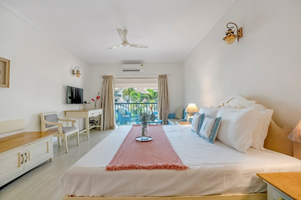 Cozy tropical themed studio in the heart of Vagator, just a short walk to the beach, Hilltop, Friday Night Market and top clubs like Romeo Lane & Mango tree restaurant. Styled with plants and earthy tones, it features a double bed, sofa & Smart TV, dining area, fully equipped kitchen and modern bathroom. Guests enjoy high-speed Wi-Fi, pool & gym access, parking for cars & bikes, 24/7 security & power backup. Perfect for couples, solo travelers or friends.
