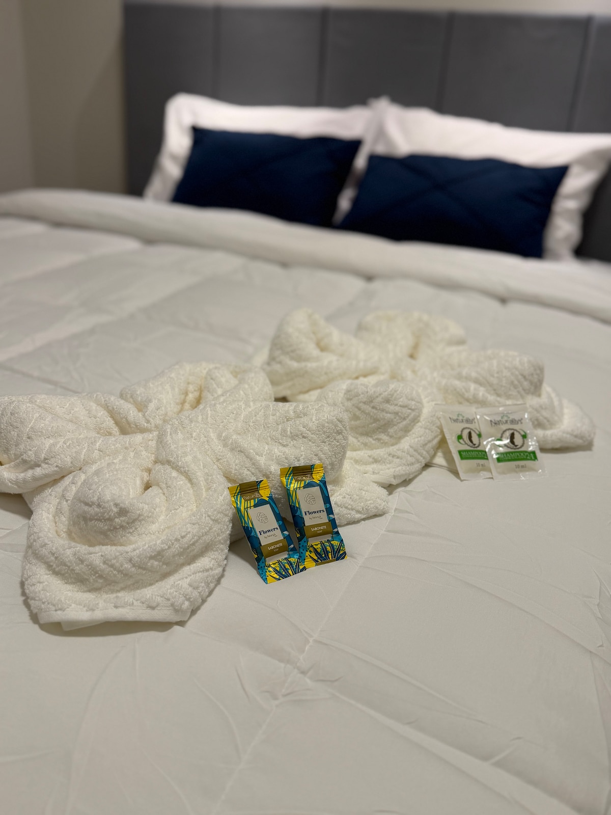 Велика квартира площею 60 кв. м із двома спальнями! Спальня 1 з двоспальним ліжком розміру queen size та телевізором. Спальня 2 з двома односпальними ліжками. Бронювання для 5 гостей, великий розкладний диван, на якому комфортно може розміститися 5-й гість». Повноцінна кухня з мінеральною водою та електричним краном. Вітальня з диваном-ліжком та телевізором SKY Premium. Помешкання розташоване в тихому, безпечному та спокійному кондомініумі для відпочинку після подорожі. 1 колонний вентилятор і 1 невеликий стельовий вентилятор у спальні 2. Вікна без ширм.