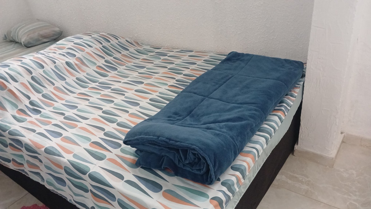 Apto SIMPLES composto por 2 quartos, 1 dos quartos com 2 camas de solteiro, o outro quarto principal com cama casal Queen Size e televisor. A cozinha está equipada com todos utensílios necessários para sua estadia e torneira elétrica. A sala de estar conta com sofá retrátil e sistema de TV SKY. O imóvel está localizado no primeiro andar em um condomínio tranquilo e calmo oferecendo um ambiente seguro e silencioso para relaxar. 1 ventilador de coluna e 1 ventilador de teto no quarto pequeno.