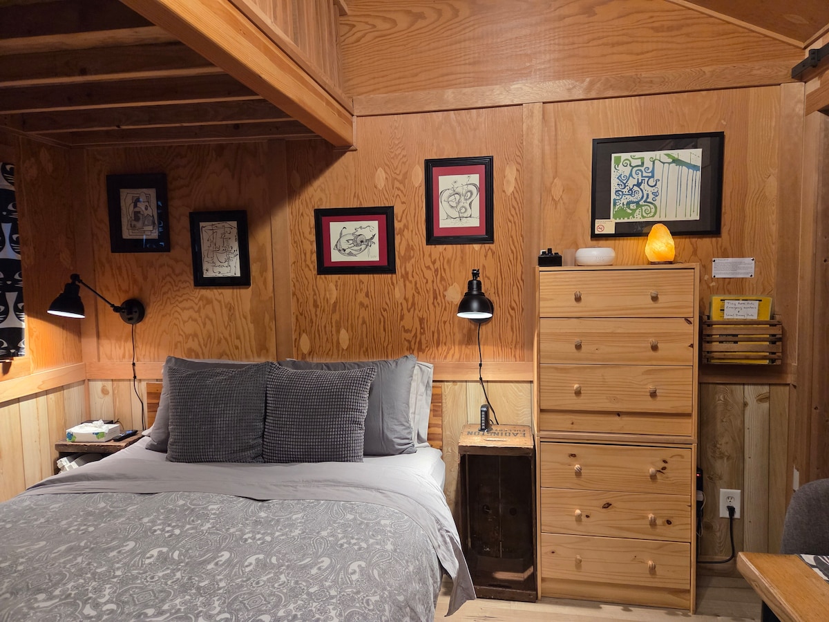 Чарівна площа 250 кв. футів Бунгало Південного Юджина в гостьовому лофті з приватним зовнішнім входом (10 сходинок вгору), ідеально підходить для 1 гостя. Повна окрема ванна кімната з раковиною, туалетом та душем.* Ліжко в шафі розміру Queen size з зручним матрацом з пінопластом, бамбуковий чохол, якісна білизна. *Хоча висота стелі ванної кімнати становить 7 футів 6дюймів на найвищому рівні, зверніть увагу, що кутові стелі в душовій можуть забезпечувати простір для гостя з високої сторони. Душова головка знімна/ручна для додаткової зручності.