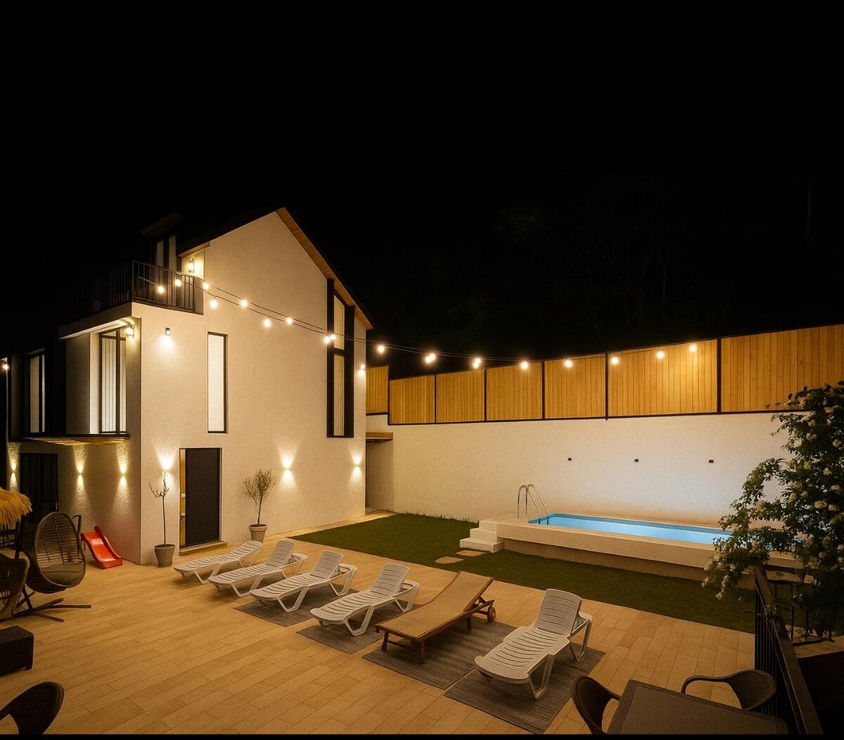 Ласкаво просимо на сучасну віллу з басейном біля Сагурамо 🌳🌴 Вілла має 5 спальних кімнат (включаючи одну головну спальню) з ліжками розміру Queen size та басейн з підігрівом розміром 12х4 метри. Три повні ванні кімнати. Кондиціонер у всіх кімнатах. Тут ви знайдете все для комфортного перебування, включаючи музичні інструменти, такі як гітара та фортепіано, караоке, настільні ігри, барбекю тощо. Розташоване в центрі в 5 хвилинах їзди від центру Сагурамо в селі Бітсменді. Мінімальний термін оренди - 2 дні.