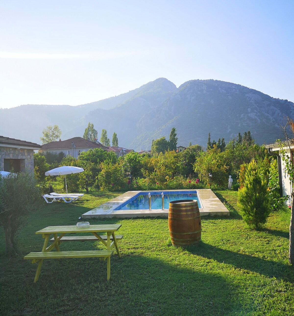The place is on the second floor of the building which is walking distance to the Dalyan center (20mins by walk, 10 mins by bike) and surrounded by pomegranate and citrus orchards. Both bedrooms have a private bathroom and also balcony and are furnished with high quality hand crafted wooden furniture. The place is spacious, has a lot of sunlight and mountain and garden views. 32sqm salt water pool is open for use of the guests