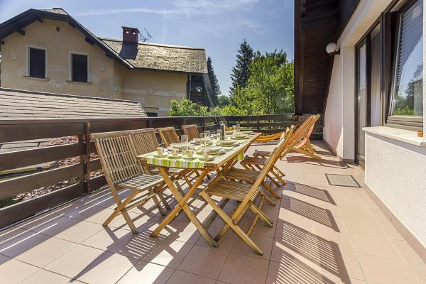 A bright and spacious 5-room apartment located right next to Bled Lake with parking and garage. It offers all the comfort and coziness of a true home, as well as the luxury of a beach right outside your door and a beautiful view of the lake, island and the Alps.
