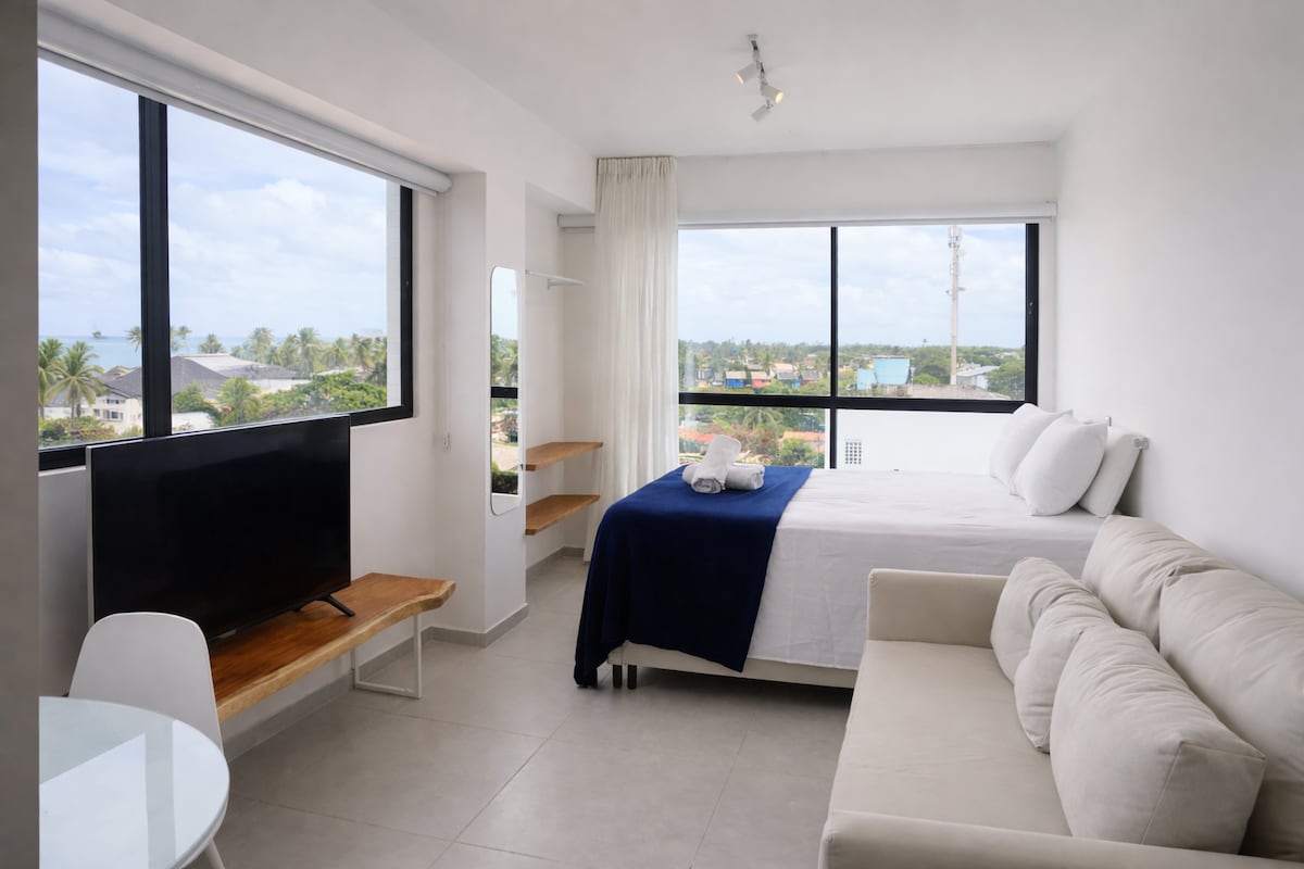 Відпочиньте на двох, відпочиваючи з морем весь час біля вікна. Насолоджуйтеся спокоєм квартири з сучасним дизайном за десять кроків від пляжного піску з усіма зручностями апарт-готелю. Розташування надзвичайно особливе, в найкращій морській ванні в Муро-Альто, в природних басейнах. У п 'яти хвилинах їзди від знаменитого ресторану Beijupirá, а також від Emporio, де є щось приємне вдома.