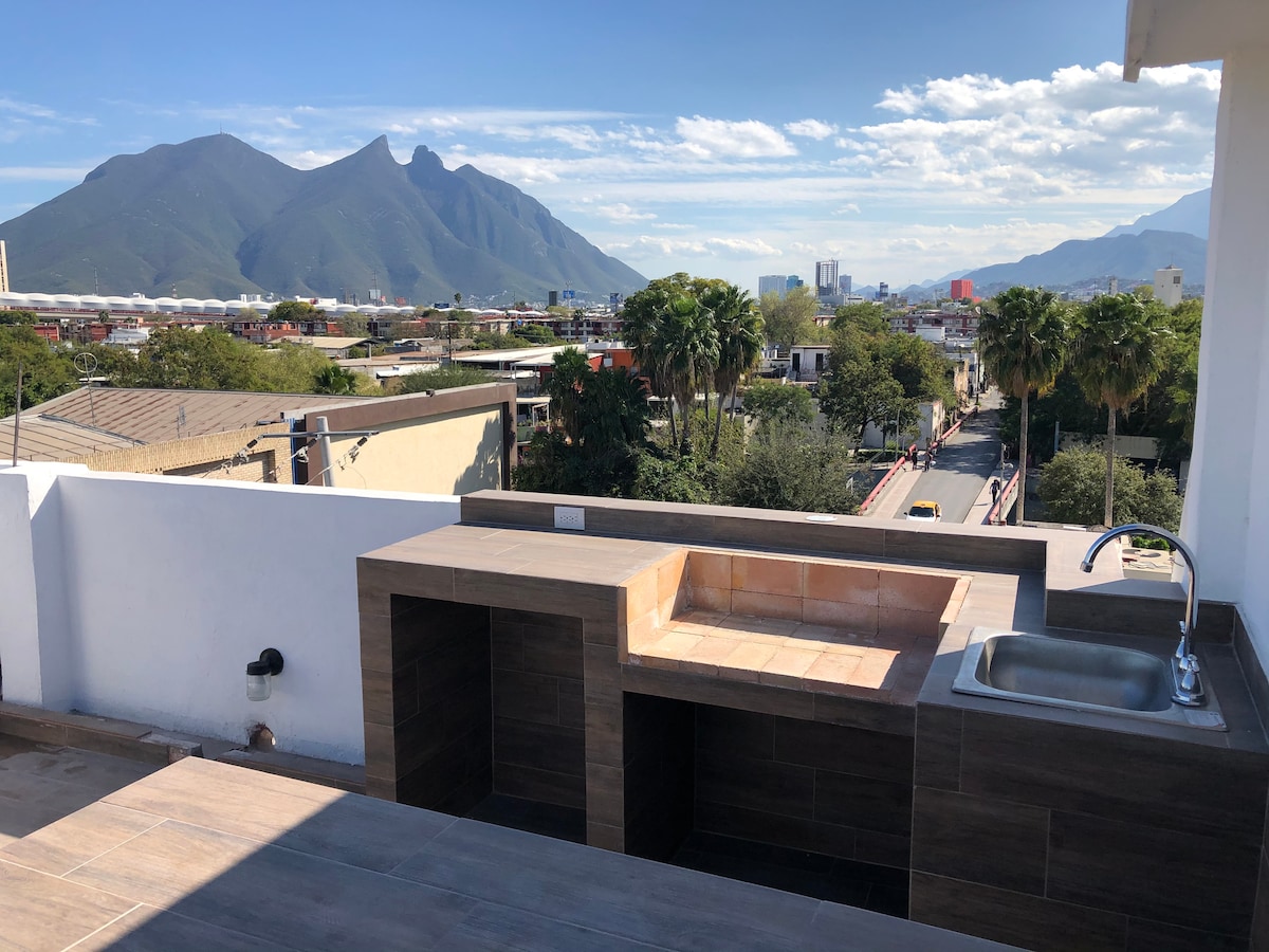 Квартира на верхньому поверсі пентхаусу в абсолютно новій житловій вежі, розташована в романтичному та історичному Барріо-Антігуо поблизу Фундідори та Сінтермекс, Арени MTY, Пабіллону M, Сан-Педро, музею МАРКО. Цей приголомшливий лофт з однією спальнею повністю оснащений італійськими дизайнерськими меблями, європейською кухнею та 5-зірковою постільною білизною та обробкою. Гості мають приватну парковку та доступ до тераси на даху з панорамним видом на місто та навколишні гори.