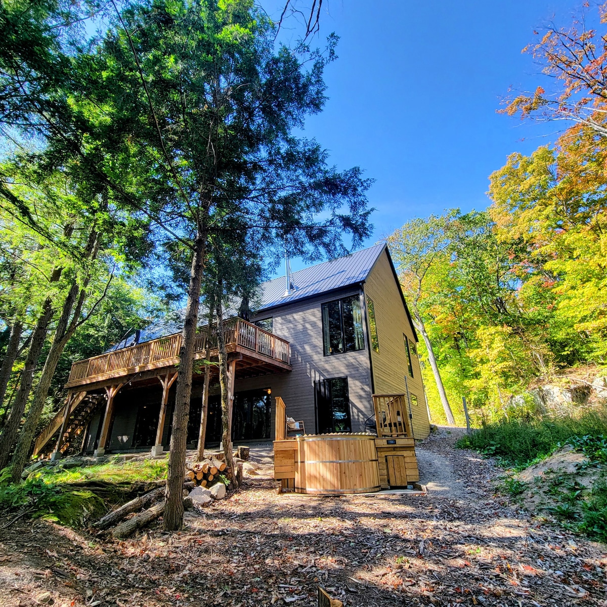 Ласкаво просимо до Muskoka A-frame, ідеального місця для відпочинку для пари або для відпочинку наодинці. Відпочиньте в *ГІДРОМАСАЖНІЙ ВАННІ**. Прокидайтеся під шелест дерев, грайте в настільні ігри та слухайте альбоми біля багаття, насолоджуючись видом на ліс. Цей класичний трикутний зруб у стилі 70-х років був переосмислений для сучасного світу. Відпочиньте або зробіть це своєю базою для пригод протягом 4 сезонів. Піші прогулянки, катання на снігоступах або бігові лижі в Лімберлості, катання на лижах/сноуборді в Хідден-Валлі, катання на ковзанах у лісі Ерроухед і відвідування ресторанів, пивоварень і місцевих закладів у Хантсвіллі