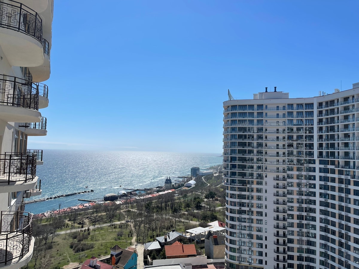Розкішна квартира з видом на море, просторою терасою та боковим видом на море. Дорогий ремонт у сучасному стилі. Простора кухня-студія, відпочиньте на затишному дивані або насолодіться ранковою кавою з виходом на терасу. Затишна окрема спальня зі зручним ліжком . Тераса - це ваш особистий простір для зустрічі з друзями, медитації або насолоди заходом сонця. Поруч парк,магазини, кафе та ресторани Закрита охоронювана зона з відеоспостереженням та підземним паркінгом. 2+2 ліжка