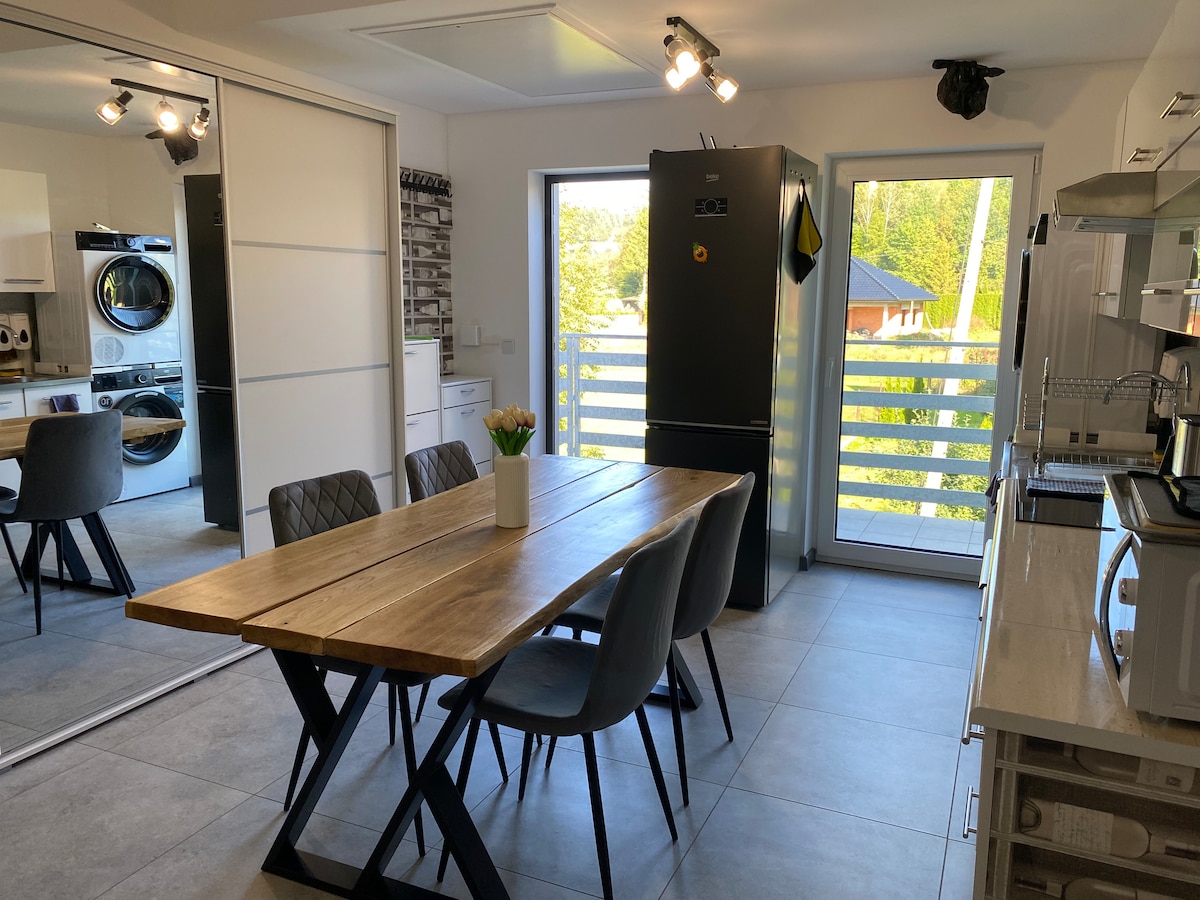 Наш сучасний, атмосферний будинок – ідеальне місце для відпочинку, вихідних, романтичного перебування або сімейного відпочинку. Будинок площею 80 кв. м розташований на великій огородженій ділянці. Інтер’єр був розроблений, щоб поєднати комфорт з унікальною атмосферою. Простора велика вітальня, відкритий мезонін, дерев’яні сходи та цегляна стіна надають інтер’єру лофтового характеру. Помешкання повністю обладнане. Для тих, хто бажає, є джакузі [мінімум 2 ночі, платно] — ідеально підходить для вечірнього відпочинку.