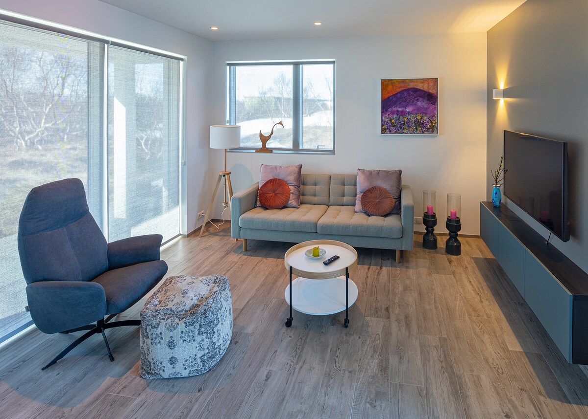 Квартира є частиною будинкового комплексу в Суннухлірі, сільськогосподарській місцевості поблизу міста Акурейрі. Квартира ідеально підходить для чотирьох дорослих, двох пар або сімей, які подорожують самостійно. Гості можуть насолодитися прекрасним видом на Ейяфьордур та Акурейрі. Додатковий збір за більш ніж двох гостей становить 18 євро за гостя за ніч.